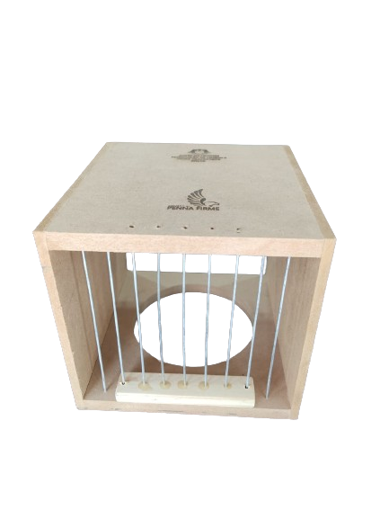 Ninho de madeira com ganchos para fixar a grade da gaiola do lado externo, pode ser fixado em portas da gaiola tanto guilhotina quanto de mola.