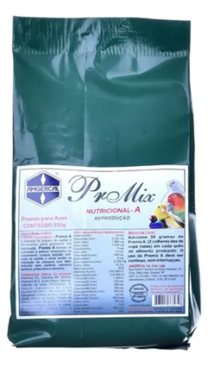 Suplemento mineral, vitamínico e aminoácido para aves. Indicação do produto: reprodução e criação. Premix A é indicado no preparo de rações e farinhadas para pássaros em reprodução e criação para fornecer os nutrientes e aditivos necessários ao crescimento, postura, eclosão, estímulo do apetite e auxilia a coloração de canários com fator. Para canários, pássaros exóticos, silvestres e psitacídeos, não possui corante.