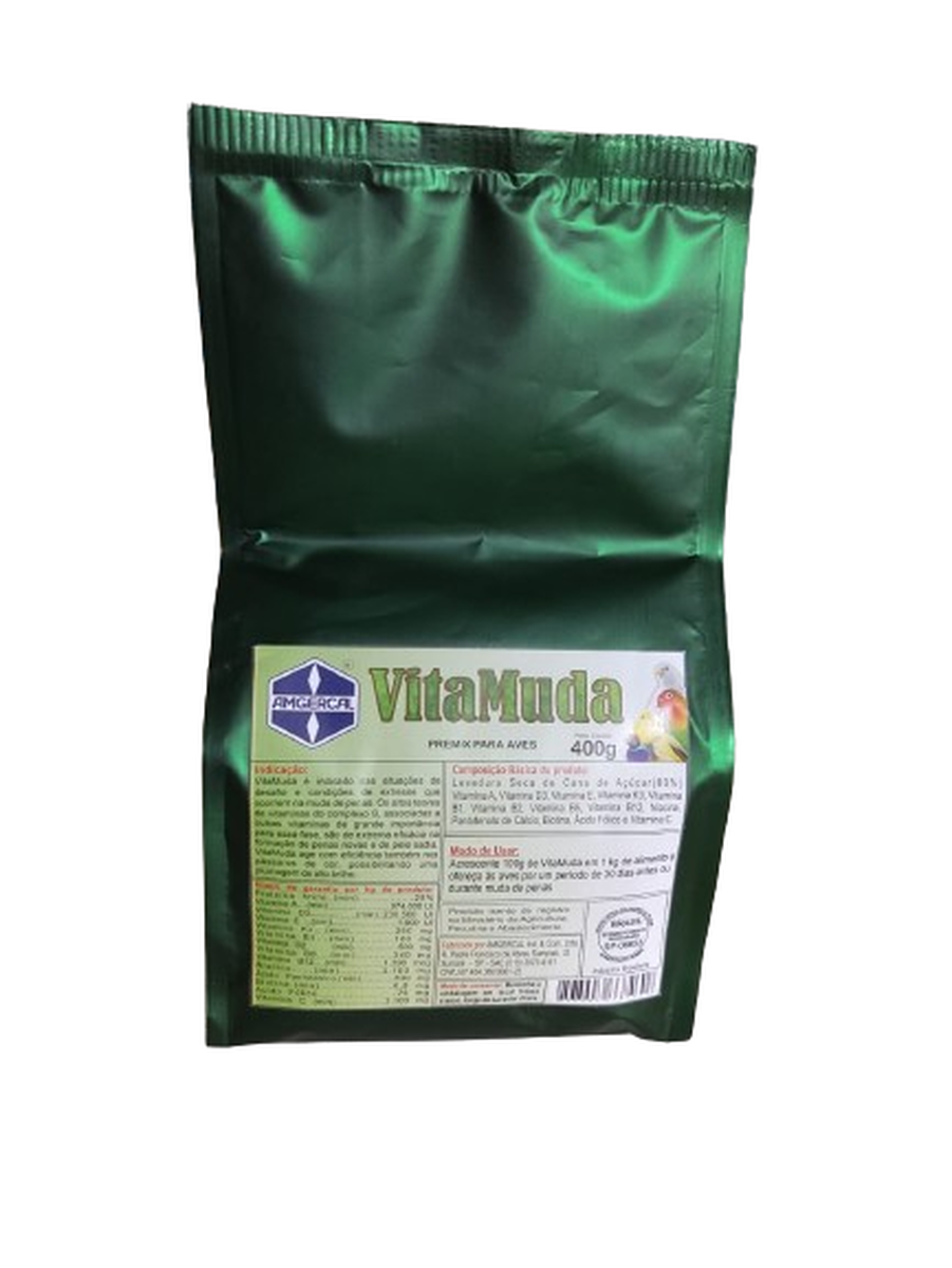 Vitamuda é indicado nas situações de desafio e condições de estresse que ocorrem na muda de penas. Os altos teores de vitaminas do complexo B, associadas a outras vitaminas de grande importância para essa fase, são de extrema eficácia na formação de penas novas e pele saida. Vitamuda age com eficiência também nos pássaros de cor, possibilitando uma plumagem de alto brilho.